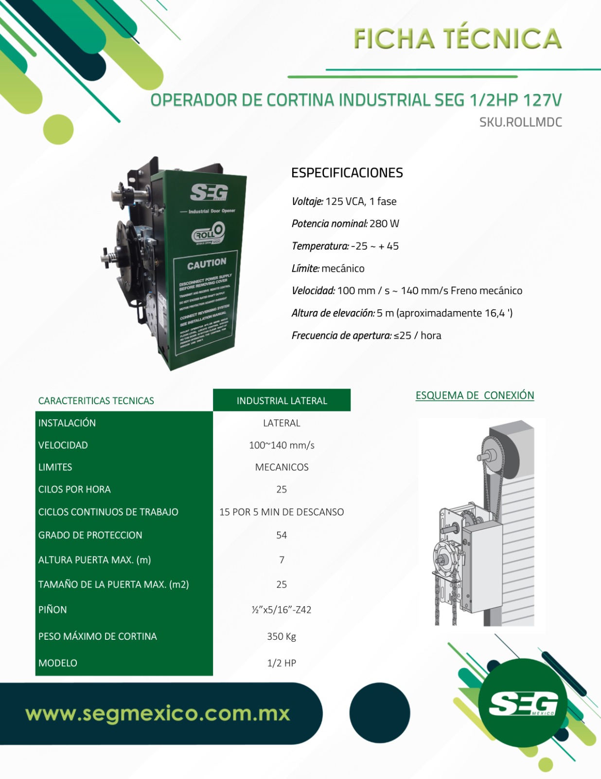 El accionador lateral ROLL MDC es de uso Industrial (25 ciclos por hora) para cortinas de hasta 25 m2. Capacidad de ½ hp. Trabajan a 125V.